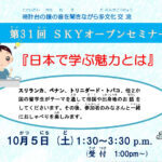 2024年10月10日 / 最終更新日時 : 2024年10月26日 info イベント 第31回SKYオープンセミナー ~留学生とアフタヌーントーク~ 終了しました。 スリランカ、ベナン、トリニダード・ドバゴ、韓国、ブラジルの5カ国の留学生が『日本で学ぶ魅力とは』のテーマで母国紹介をして下さいました。その後、一般市民と日本語で交流しました。 参加者:一般市民 20名、発表者 5名、ボラ […]